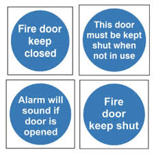 Blue circular signs with white symbols indicate mandatory actions during fire emergencies. Common examples include "Fire Door Keep Shut" signs that prevent fire spread through buildings.