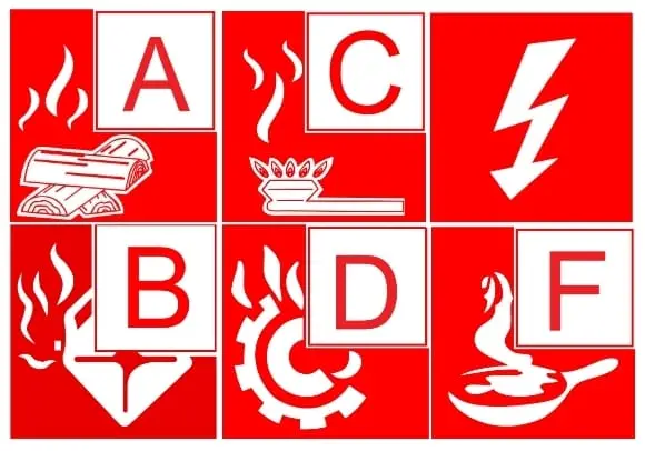 Fire extinguisher signs feature a red square or rectangular background with white symbols showing the extinguisher type. The signs display clear pictograms indicating which fires the extinguisher can tackle.